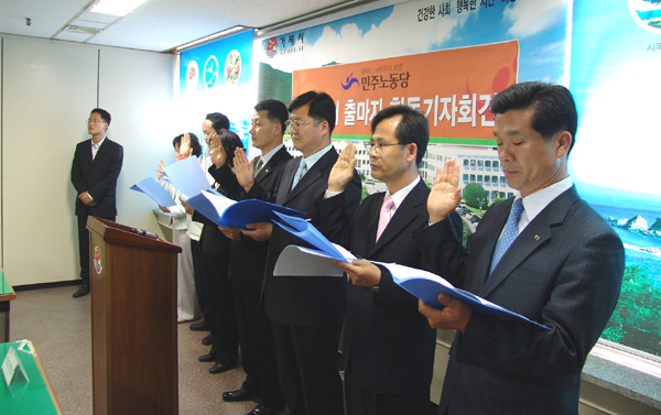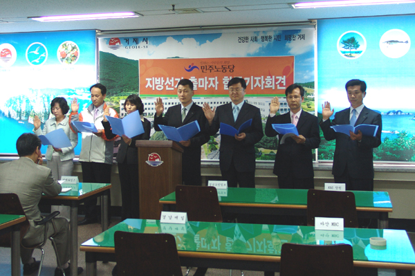 5.31Áö¹æ¼±°Å¿¡ Ã⸶ÇÏ´Â ¹ÎÁֳ뵿´ç Èĺ¸ 7¸íÀº 17ÀÏ ¿ÀÀü 11½Ã °ÅÁ¦½Ãû ºê¸®Çη뿡¼ ÇÕµ¿ ±âÀÚȸ°ßÀ» °®°í °¢ È帵éÀÇ Ãâ»çÇ¥¿Í Á¤Ã¥¹ßÇ¥, °øÁ÷ÀÚ À±¸®¼±¼½ÄÀ» °¡Á³´Ù.