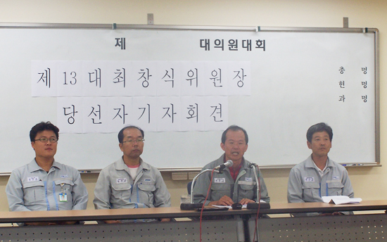 ´ë¿ìÁ¶¼±³ëÁ¶ ÃÖâ½Ä À§¿øÀå(45)Àº 10¿ù 6ÀÏ ¿ÀÈÄ 1½Ã ³ëÁ¶»ç¹«½Ç¿¡¼ ´ç¼±ÈÄ Ã³À½À¸·Î °ø½Ä ±âÀÚȸ°ßÀ» °¡Á³´Ù.