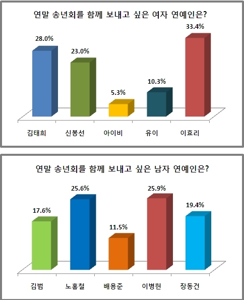 ¡®¿¬¸» ¼Û³âȸ¸¦ ÇÔ²² º¸³»°í ½ÍÀº ¿©ÀÚ ¿¬¿¹ÀΡ¯À¸·Î´Â °¡¼ö ÀÌÈ¿¸®°¡ 33.4%(388¸í)·Î 1À§¸¦ Â÷ÁöÇß´Ù. µå¶ó¸¶ ¾ÆÀ̸®½º·Î ½ÃûÀÚµéÀÇ È£ÆòÀ» ¹ÞÀ¸¸ç Àα⸦ ¾ò°í ÀÖ´Â ¹è¿ì ±èÅÂÈñ´Â 28.0%(325¸í)·Î µÚ¸¦ À̾ú´Ù. Áö³ÇØ Á¶»ç¿¡¼ 1À§¸¦ Â÷ÁöÇß´ø °³±×¿ì¸Õ ½ÅºÀ¼±Àº 23.0%(267¸í)¸¦ ¾ò¾î 3À§¸¦ ±â·ÏÇß°í, ¾ÖÇÁÅͽºÄðÀÇ À¯ÀÌ´Â 10.3%(120¸í), °¡¼ö ¾ÆÀ̺ñ 5.3%(62¸í) ¼øÀ̾ú´Ù.