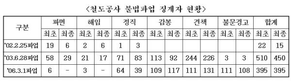 ½ÇÁ¦·Î Áö³ 2006³â ºÒ¹ýÆÄ¾÷¿¡ °¡´ãÇÏ¿© ¡°è¸¦ ¹ÞÀº Àοø ÃÑ 395¸í Áß Ã¶µµ°ø»ç ¡°èÀ§¿øÈ¸ ½ÉÀÇ¿¡¼ 73¸íÀÌ Áß¡°è¸¦ ¹Þ¾ÒÁö¸¸(ÆÄ¸é6, ÇØÀÓ3, Á¤Á÷64) ÇàÁ¤¼Ò¼ÛÀ» ÅëÇÑ ÃÖÁ¾½É¿¡¼ ÆÄ¸é°ú ÇØÀÓ ¾øÀÌ Á¤Á÷ 39¸í¿¡ ±×Ä¡´Â µî ¡°èÀÚ ´ëºÎºÐÀÌ ¼Ø¹æ¸ÁÀÌ Ã³¹úÀ» ¹ÞÀº °ÍÀ¸·Î µå·¯³µÀ¸¸ç, °ú°ÅÀÇ »ç·Ê¸¦ ºñÃ纼 ¶§ 2009³â¿¡µµ Áß¡°èÀÚ(ÇØÀÓ3, Á¤Á÷16) ¸ðµÎ ÇàÁ¤¼Ò¼ÛÀ» ÅëÇØ Çâ ÈÄ °æÂ¡°è óºÐ¿¡ ±×Ä¥ °ÍÀ¸·Î ¿¹»óµÇ¾î ºÒ¹ý ÆÄ¾÷ÀÇ °í¸®´Â ½±°Ô ²÷¾îÁöÁö ¾ÊÀ» °ÍÀ̶ó´Â Àü¸ÁÀÌ ³ª¿À°í ÀÖ´Ù.