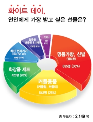 À̾î Ä¿Çøµ, Ä¿ÇÃÆ¼ µîÀÇ Ä¿Çÿëǰ(543¸í/25%)ÀÌ 2À§, ÈÀåǰ ¼¼Æ®(420¸í/20%)°¡ 3À§, ¾ÆÀÌÆù, PMP, MP3 °°Àº ÃֽŠÀüÀÚ±â±â(364¸í/17%)°¡ 4À§, ´ÞÄÞÇÑ ÃÊÄݸ´&»çÅÁ(178¸í/8%)ÀÌ 5À§¸¦ Â÷ÁöÇß´Ù.