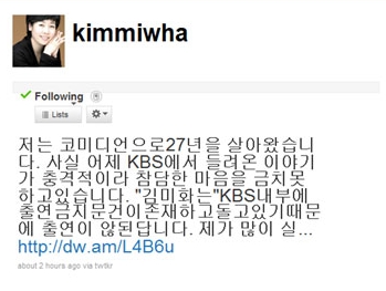 ±è¹ÌÈ´Â 6ÀÏ ¿ÀÀü ÀÚ½ÅÀÇ Æ®À§ÅÍ¿¡ "KBS ³»ºÎ¿¡ Ã⿬±ÝÁö ¹®°ÇÀÌ Á¸ÀçÇØ Ã⿬ÇÏÁö ¸øÇϰí ÀÖ´Ù¡±¸ç ¡°¾îÁ¦ KBS¿¡¼ µé·Á¿Â À̾߱Ⱑ Ãæ°ÝÀûÀ̶ó Âü´ãÇÑ ¸¶À½À» ±ÝÄ¡ ¸øÇϰí ÀÖ´Ù"°í ¹àÇû´Ù.