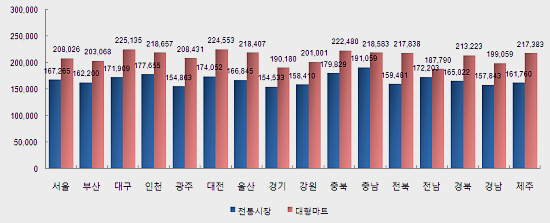 Áö¿ªº° Á¶»ç°á°ú¸¦ º¸¸é, ÀüÅë½ÃÀå°ú ´ëÇü¸¶Æ®ÀÇ °¡°ÝÂ÷À̰¡ ´Ù¼Ò ÀÖ´Â °ÍÀ¸·Î ³ªÅ¸³µ´Ù.