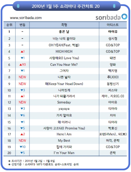 ¾ÆÀÌÀ¯ÀÇ ¡®ÁÁÀº ³¯¡¯ÀÌ ´ëÇѹα¹À» ´ëÇ¥ÇÏ´Â ¾ÆÀ̵¹ ±×·ìÀÎ µ¿¹æ½Å±â¿Í ºò¹ðÀÇ GD&TOPÀ» Á¦Ä¡°í ¼Ò¸®¹Ù´Ù 2011³â 1¿ù ù° ÁÖ(1¿ù 2ÀÏ~1¿ù 8ÀÏ)Â÷Æ® Á¤»óÀ» Â÷ÁöÇϸç 4ÁÖ ¿¬¼Ó 1À§ ÀÚ¸®¸¦ ÁöÄ×´Ù.