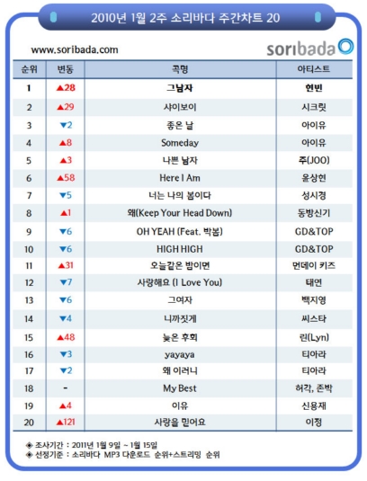 ÇöºóÀÇ ¡®±× ³²ÀÚ¡¯°¡ 4ÁÖ° 1À§¸¦ Áö۰í ÀÖ´ø ¾ÆÀÌÀ¯ÀÇ ¡®ÁÁÀº ³¯¡¯À» Á¦Ä¡°í ¼Ò¸®¹Ù´Ù 1¿ù µÑ° ÁÖ(1¿ù 9ÀÏ~1¿ù 15ÀÏ) ÁÖ°£Â÷Æ® Â÷Æ® Á¤»óÀ» Â÷ÁöÇß´Ù. ÇöºóÀÌ ºÎ¸¥ ¡®±× ³²ÀÚ¡¯´Â Çöºó ƯÀ¯ÀÇ ¸Å·ÂÀûÀÎ ÁßÀúÀ½ º¸À̽º°¡ µ¸º¸ÀÌ´Â °îÀ¸·Î À½¿øÀ» °ø°³ÇÏÀÚ¸¶ÀÚ 1À§¸¦ Â÷ÁöÇÏ¸ç µÎ ´Þ µ¿¾È 20À§±Ç ³»¿¡ ¸Ó¹°·¶Áö¸¸ ´Ü Çѹøµµ Á¤»ó¿¡ ¿À¸£Áö ¸øÇÑ ¡®±× ¿©ÀÚ¡¯ÀÇ ¾Æ½¬¿òÀ» ´Þ·¡Áá´Ù.
