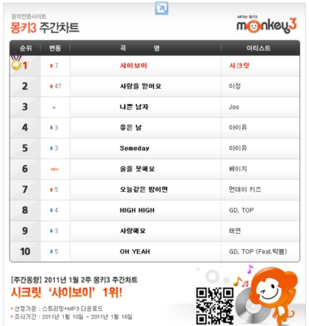 1¿ù 2ÁÖ ¸ùŰ3 ÁÖ°£Â÷Æ®´Â ¿©°¡¼öµéÀÇ °¼¼°¡ µÎµå·¯Áø °ÍÀÌ Æ¯Â¡ÀÌ´Ù. ½ÃÅ©¸´, ¾ÆÀÌÀ¯ ¿Ü¿¡µµ ÁÖ(Joo)ÀÇ ¡®³ª»Û ³²ÀÚ¡¯°¡ 3À§¸¦ ±â·ÏÇßÀ¸¸ç, º£ÀÌÁöÀÇ ¡®¼úÀ» ¸øÇؿ䡯°¡ 6À§¿¡ »õ·Ó°Ô À̸§À» ¿Ã·È°í, ¼Ò³à½Ã´ë Å¿¬ÀÇ ¡®»ç¶ûÇØ¿ä¡¯(SBSµå¶ó¸¶ ¡®¾ÆÅ׳ª:ÀüÀïÀÇ ¿©½Å¡¯ OST)°¡ 9À§·Î ±× ±â¼¼¸¦ ´õÇß´Ù.