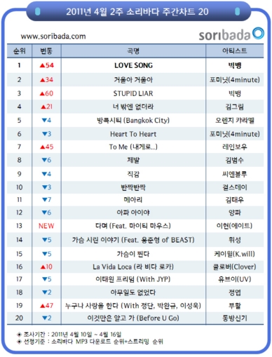 ºò¹ðÀÌ ½ºÆä¼È ¿¡µð¼Ç ¾Ù¹üÀÇ Å¸ÀÌÆ²°î 'LOVE SONG(·¯ºê ¼Û)'À¸·Î ¼Ò¸®¹Ù´Ù 4¿ù µÑ° ÁÖ(4¿ù 10ÀÏ~ 4¿ù 16ÀÏ) ÁÖ°£Â÷Æ® 1À§¸¦ Â÷ÁöÇß´Ù. Áö³ 3¿ù 2ÁÖ ¿¬¼Ó 1À§(3¿ù ù° ÁÖ~µÑ° ÁÖ)¸¦ Â÷ÁöÇÑ ¡®TONIGHT(Åõ³ªÀÕ)¡¯¿¡ ÀÌ¾î ´Ü 4ÁÖ ¸¸¿¡ Â÷Æ® Á¤»óÀ» µÇãÀº Áø±â·ÏÀ» ¼¼¿î °ÍÀÌ´Ù.