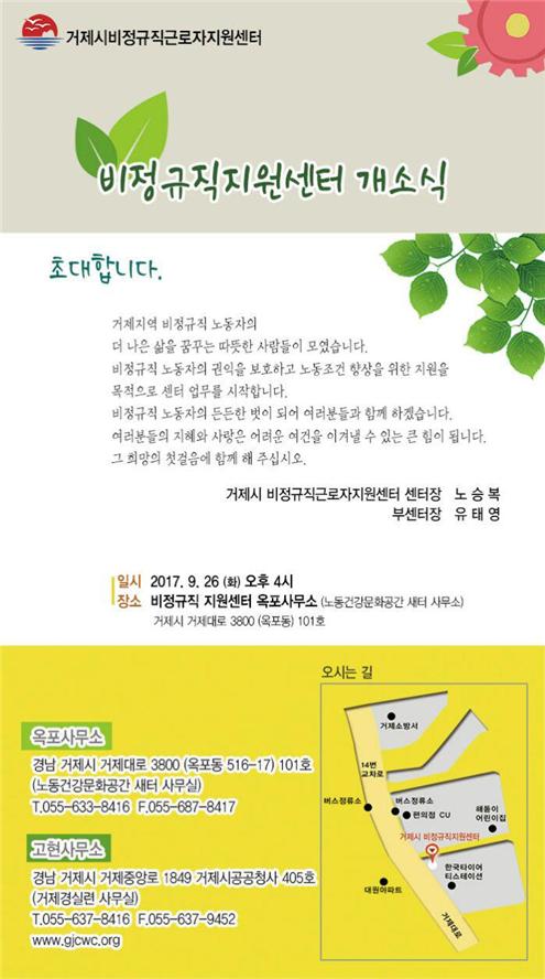 °ÅÁ¦½Ã ºñÁ¤±ÔÁ÷ ±Ù·ÎÀÚ Áö¿ø¼¾ÅÍ´Â ¾ÆÁÖ/¿ÁÆ÷(055-633-8416), °íÇö/ÀåÆò(055-637-8416) 2°³ »ç¹«½ÇÀ» ¿î¿µÇϰí ÀÖÀ¸¸ç, À§Å¹°è¾à±â°£Àº 2017³â 9¿ù 1ÀϺÎÅÍ 2019³â 8¿ù 31ÀϱîÁö´Ù.