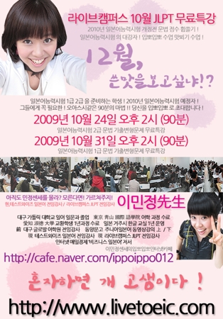 Áö³ 6¿ù óÀ½ ¼ºñ½º¸¦ °³½ÃÇÑ ÀÌ·¡ ±¹³» ´ëÇ¥ »ý¹æ¼Û ¾îÇаÀÇ »çÀÌÆ®·Î ÀÚ¸®ÀâÀº ¶óÀ̺êÄ·ÆÛ½º(http://www.livetoeic.com)°¡ ¿À´Â 12¿ù¿¡ Ä¡·¯Áú ÀϺ»¾î´É·Â½ÃÇè(JLPT)À» ´ëºñÇϱâ À§ÇÑ ¹«·á Ư°À» ½Ç½ÃÇÑ´Ù. À̹ø Ư°Àº 2009³â 12¿ù ÀϺ»¾î´É·Â½ÃÇè 1±Þ ¶Ç´Â 2¡¦