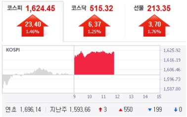 17ÀÏ ÄÚ½ºÇÇ Áö¼ö°¡ °£¹ã 170Æ÷ÀÎÆ® ±Þµî¼¼¸¦ º¸ÀÎ ¹Ì±¹ ´º¿åÁõ½ÃÀÇ ±Þµî¿¡ ÈûÀÔ¾î ÀåÁß 20ÀÏ À̵¿Æò±Õ¼±(1,620¼±)À» µ¹ÆÄÇÏ´Â °¼¼ÀåÀ» ¿¬ÃâÇϰí ÀÖ´Ù. ½Ã°¡ÃÑ¾× »óÀ§ Á¾¸ñµµ Àü¹ÝÀûÀ¸·Î »ó½Â¼¼¸¦ º¸¿©ÁÖ°í ÀÖ´Ù. »ï¼ºÀüÀÚ, Æ÷½ºÄÚ, Çѱ¹Àü·Â, SKÅÚ·¹ÄÞ, Çö´ë¸ðºñ½º¡¦