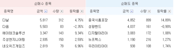 8ÀÏ ÄÚ½ºÇÇ ½ÃÀå ±â°ü ¼ø¸Å¼ö »óÀ§ Á¾¸ñÀº LGµð½ºÇ÷¹ÀÌ, KT, LGÀüÀÚ, SK¿¡³ÊÁö, È¿¼º ¼øÀ̰í, ¼ø¸Åµµ »óÀ§ Á¾¸ñÀº Çö´ë¸ðºñ½º, KB±ÝÀ¶, POSCO(Æ÷½ºÄÚ), ÇÏÀ̴нº, Çö´ë°Ç¼³ ¼øÀ̾ú´Ù. ¹Ý¸é ¿Ü±¹ÀÎ ¼ø¸Å¼ö »óÀ§ Á¾¸ñÀº Çö´ë¸ðºñ½º, SKÅÚ·¹ÄÞ, POSCO, Çö´ë°Ç¼³, »ï¼º¡¦
