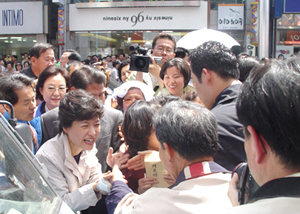 [ÃÖÁ¾]=¹Ú±ÙÇý ´ëÇ¥ÀÇ °ÅÁ¦¹æ¹®ÀÌ Ç¥½ÉÀ» ´Þ±É´Ù. °íÇö»ç°Å¸®´Â ¹Ú ´ëÇ¥¸¦ °¡±îÀ̼ º¸·Á´Â ÁöÁöÀÚµéÀÌ ¸ô·Áµé¾î ÇѶ§ ±³ÅëÀÌ ¸¶ºñµÉ Á¤µµ¿´´Ù. ÇϼøºÀ ÀÇ¿ø°ú ±è±âÃá Èĺ¸ÀÇ ºÎÀÎ ¹ÚÈÀÚ¾¾¿Í ÇÔ²² ¿¬¼³Â÷·®¿¡ ¿À¸¥ ¹Ú ´ëÇ¥´Â 10¿©ºÐÀÇ ¿¬¼³ ÈÄ¿¡ ¹Ú±ÙÇý¸¦ ¿¬È£¡¦