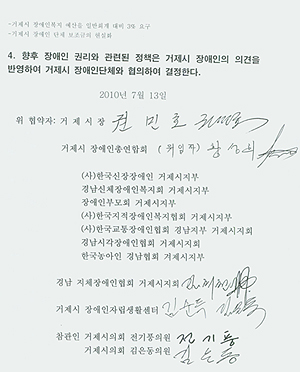 °æ³² Àå¾ÖÀÎÀÚ¸³»ýȰ¼¾ÅÍÇùÀÇȸ(ÀÌÇÏ: ÇùÀÇȸ) ¼Ò¼Ó Àå¾ÖÀεéÀÌ ÀÏÁÖÀϰ °ÅÁ¦½ÃÀå½Ç Á¡°Å³ó¼ºÀ» À̾°í ÀÖ´Â °¡¿îµ¥ °ÅÁ¦½Ã Àå¾ÖÀÎ ÃÑ¿¬ÇÕȸ¿Í °ÅÁ¦½Ã°¡ 4°¡Áö Àå¾ÖÀÎÁ¤Ã¥¿¡ ´ëÇØ ÇÕÀÇÇϰí Çù¾à½ÄÀ» °¡Á³´Ù.