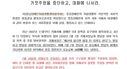°æ³²Àå¾ÖÀÎÀÚ¸³»ýȰ¼¾ÅÍÇùÀÇȸ ȸ¿øµéÀÇ °ÅÁ¦½ÃÀå½Ç ¾Õ Á¡°Å³ó¼ºÀÌ 3ÁÖ°´Ù. Áö³ 2007³â °ÅÁ¦½Ã°¡ ÇùÀÇȸ¿Í ÇÕÀÇÇÑ Àå¾ÖÀÎ 5´ë Á¤Ã¥À» ÀÌÇàÇÏÁö ¾ÊÀº °ÍÀÌ Àå¾ÖÀεéÀÌ ³ó¼ºÀ» ½ÃÀÛÇÑ ÀÌÀ¯´Ù. À̵éÀÇ Á¡°Å³ó¼ºÀ» ¹Ù¶óº¸´Â °ÅÁ¦½Ã¹ÎµéÀÇ ½Ã¼±Àº Â÷°©±â¸¸ ÇÏ´Ù. Àڽš¦