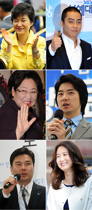 ¹Ú±ÙÇý, È«Á¤¿í, À̰æÀç, ¹Ú»óõ, ±èÀ»µ¿ ÀÇ¿øÀÇ °øÅëÁ¡Àº? 18´ë ±¹È¸ÀÇ¿øÀÓ°ú µ¿½Ã¿¡ À¯¸í ¿¬¿¹ÀÎÀ» °¡Á·À¸·Î µÐ Á¤Ä¡ÀεéÀ̶ó´Â °ÍÀÌ´Ù. »ç½Ç Á¤Ä¡Àΰú ¿¬¿¹ÀÎÀº ´ëÁßÀÇ °ü½É°ú »ç¶ûÀ» ÅëÇØ ÁöÁö¸¦ ¾ò¾î¾ß ÇÑ´Ù´Â Á¡¿¡¼ ¹¦ÇÏ°Ô ´àÀº Á¡µµ ÀÖ´Ù. À̶§¹®ÀÎÁö À̵鳢¡¦