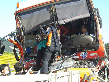 7ÀÏ ¿ÀÀü 10½Ã25ºÐ²² °æºÎ°í¼Óµµ·Î °æÁÖ¿¡¼ ¿ï»ê¹æÇâ ¿ïÁÖ±º µÎ¼¸é Àκ¸¸® Àκ¸±³ ÀαÙ(ºÎ»ê±âÁ¡ 48§°) ÇÏÇ༱¿¡¼ µµ·Î°ø»ç¸¦ ÇÏ´ø Æ®·°°ú °ü±¤¹ö½º 4´ë°¡ Ãßµ¹ÇÏ´Â »ç°í°¡ ¹ß»ýÇß´Ù. Æ®·°°ú Ãßµ¹ÇÑ °ü±¤¹ö½º´Â Áß¾Ó °æ°è¼®°ú Ãæµ¹ÇÏ´Â µîÀÇ 2Â÷ »ç°í·Î ¹ö½º ½Â°´¡¦
