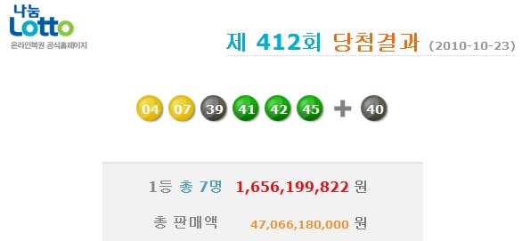 10¿ù 23ÀÏ ½Ç½ÃµÈ Á¦ 412ȸ ³ª´® ·Î¶Ç 1µî ´ç÷¹øÈ£´Â '4, 7, 39, 41, 42, 45'¹øÀ̸ç, 2µî º¸³Ê½º ¹øÈ£´Â '40'¹øÀÌ´Ù.