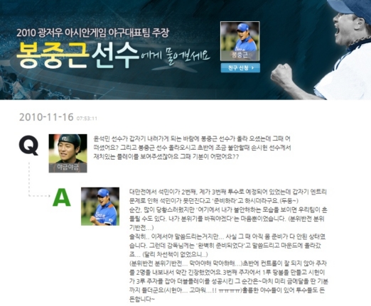 ºÀÁß±Ù ¼±¼ö°¡ ¹ÌÅõµ¥ÀÌ¿Í ÇÔ²² ÁøÇàÇϰí ÀÖ´Â ¡®ºÀÁß±Ù ¼±¼ö¿¡°Ô ¹°¾îº¸¼¼¿ä¡¯Äڳʸ¦ ÅëÇØ 13ÀÏ ´ë¸¸ÀüÀÇ °©ÀÛ½º·¯¿î µîÆÇ¿¡ ´ëÇÑ ¼ÖÁ÷ÇÑ ¼Ò°¨À» ¹àÇû´Ù. ºÀÁß±ÙÀº Áö³ 13ÀÏ ´ë¸¸Àü¿¡¼ °æ±â ÃâÀü ¼±¼ö ¸í´Ü Á¦Ãâ ¶§ ÀúÁö¸¥ ½Ç¼ö Å¿¿¡ À±¼®¹Î ¼±¼ö¸¦ ´ë½ÅÇØ ±ÞÇÏ¡¦