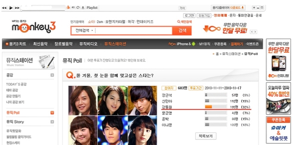 °µ¿¿øÀÌ Ã¹´«À» ÇÔ²² ¸Â°í ½ÍÀº ¿¬¿¹ÀÎÀ¸·Î ²ÅÇû´Ù. À½¾ÇÀü¹®»çÀÌÆ® ¸ùŰ3°¡ 11¿ù 11ÀϺÎÅÍ 17ÀϱîÁö ¡®Ã¹´«À» ÇÔ²² ¸Â°í ½ÍÀº ½ºÅ¸¡®¶ó´Â ÁÖÁ¦·Î ¼³¹®Á¶»ç¸¦ ÇÑ °á°ú, °µ¿¿øÀÌ ÃÑ 603 ¸í °¡¿îµ¥ 32%(195¸í)ÀÇ ÁöÁö·Î 1À§¿¡ ¿Ã¶ú´Ù. ¿ì¿ùÇÑ ¿Ü¸ðÀÇ ¡®¿Ï¼Ò³²¡¯ °¡¦