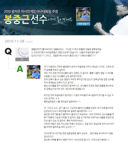 À̹ø ±¤Àú¿ì ¾Æ½Ã¾È°ÔÀÓ ±â°£ µ¿¾È ¹ÌÅõµ¥ÀÌ ¡®ºÀÁß±Ù¼±¼ö¿¡°Ô ¹°¾îº¸¼¼¿ä¡¯ Äڳʸ¦ ÅëÇØ ¹ÌÄ£(¹ÌÅõµ¥ÀÌ Ä£±¸)µé°ú Ȱ¹ßÇÏ°Ô ¼ÒÅëÇß´ø ºÀÁß±Ù ¼±¼ö°¡ ¸¶Áö¸· ´äº¯À» ÅëÇØ ¹ÌÄ£µé°ú ÀλçÇß´Ù. ºÀÁß±ÙÀº 28ÀÏ ¹ÌÅõµ¥ÀÌ¿¡ ´ë¸¸Àü¿¡¼ ½ÇÁ¡ÇÑ Åõ¼ö°¡ ´ßÀ» ¸Ô±â·Î Çß´Ù´Â ¡¦