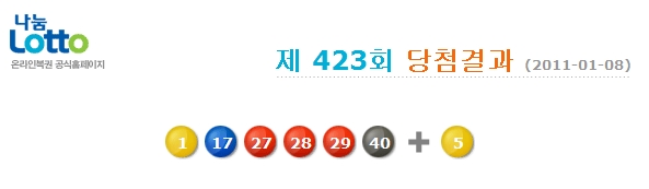 1¿ù 8ÀÏ ½Ç½ÃµÈ Á¦423ȸ ³ª´®·Î¶Ç 1µî ´ç÷¹øÈ£´Â '1, 17, 27, 28, 29, 40'¹øÀ̸ç, 1µî º¸³Ê½º ¹øÈ£´Â 5¹øÀÌ´Ù.