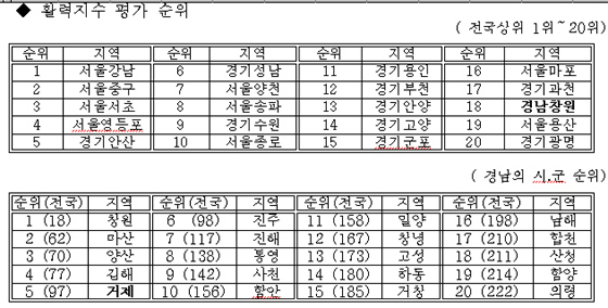ÇàÁ¤ÀÚÄ¡ºÎÀÇ ³«ÈÄÁö¿ª ¼±Á¤ÁöÇ¥ °è»ê °ø½Ä¿¡ µû¶ó Àü±¹ 234°³ ½Ã.±º.±¸ÀÇ È°·ÂÆò°¡µµ¸¦ Á¶»çÇÑ °á°ú ¼¿ïÀÇ °³²±¸°¡ 1À§¸¦ Â÷ÁöÇß°í, 1À§ºÎÅÍ »óÀ§ 20À§ ¾È¿¡ 17°÷ÀÌ ¼¿ï, °æ±âµî ¼öµµ±Ç¿¡ ÁýÁß µÆÀ¸¸ç °æ³² â¿øÀÌ ºñ¼öµµ±ÇÀ¸·Î´Â À¯ÀÏÇÏ°Ô »óÀ§ 20À§ ³»¿¡ µé¾úÀ½ÀÌ¡¦ |