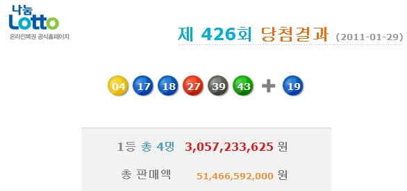 2011³â 1¿ù 29ÀÏ ½Ç½ÃµÈ Á¦426ȸ ³ª´®·Î¶Ç 1µî ´ç÷¹øÈ£´Â '4, 17, 18, 27, 39, 43'¹øÀ̸ç, 1µî º¸³Ê½º ¹øÈ£´Â 19¹øÀÌ´Ù. 426ȸÂ÷ ³ª´®·Î¶Ç ÃÑ ÆÇ¸Å¾×Àº 514¾ï6659¸¸2000¿øÀÌ´Ù. 6°³ ¹øÈ£¸¦ ¸ðµÎ ¸ÂÈù 1µîÀº 4¸íÀ¸·Î 1Àδç 30¾ï5723¸¸3625¿ø¾¿ÀÇ ´ç÷±ÝÀ» ¹Þ°Ô µÆ´Ù.¡¦