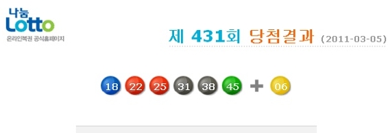 3¿ù 5ÀÏ ½Ç½ÃµÈ Á¦431ȸ ³ª´®·Î¶Ç 1µî ´ç÷¹øÈ£´Â '18, 22, 25, 31, 38, 45'¹øÀ̸ç, 1µî º¸³Ê½º ¹øÈ£´Â 6¹øÀÌ´Ù. Á¦431ȸ ³ª´®·Î¶Ç ÃÑ ÆÇ¸Å¾×Àº 516¾ï6194¸¸¿øÀÌ´Ù. 6°³ ¹øÈ£¸¦ ¸ðµÎ ¸ÂÈù 1µîÀº ÃÑ 10¸íÀ¸·Î 1Àδç 12¾ï6843¸¸¿øÀÇ ´ç÷±ÝÀ» ¹Þ°Ô µÆ´Ù. 1µî ¹øÈ£ Áß¡¦