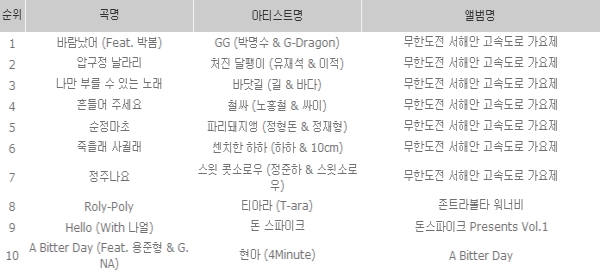 À¯¹«¼± À½¾ÇÆ÷ÅÐ µµ½Ã¶ô 7¿ù 2ÁÖÂ÷ ÁÖ°£Â÷Æ® (7¿ù3ÀÏ-9ÀÏ) ¿¡ µû¸£¸é ÁÖ°£Â÷Æ® 1À§-7À§±îÁö ¹«ÇѵµÀü ¼ÇØ¾È °¡¿äÁ¦ °îµéÀÌ Â÷ÁöÇß´Ù. 1À§´Â GG(¹Ú¸í¼ö, G-Dragon)ÀÇ ¡®¹Ù¶÷³µ¾î¡¯, 2À§´Â óÁø´ÞÆØÀÌ (À¯Àç¼®, ÀÌÀû)ÀÇ ¡®¾Ð±¸Á¤ ³¯¶ó¸®¡¯, 3À§´Â ¹Ù´å±æ(±æ, ¹Ù´Ù)ÀÇ¡¦