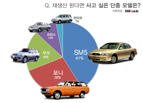 Áö±Ý ´Ù½Ã ³ª¿Â´Ù¸é »ç°í ½ÍÀº ÀÚµ¿Â÷°¡ ÀÖÀ»±î? Áß°íÂ÷ Àü¹® ¾÷ü Ä«Áî¿¡¼ ½Ã´ëº° Àα⠸ðµ¨À» ´ë»óÀ¸·Î ¼³¹®Á¶»ç¸¦ ½Ç½ÃÇÑ °á°ú, Àç»ý»ê µÈ´Ù¸é »ç°í ½ÍÀº ´ÜÁ¾¸ðµ¨ 1À§¿¡ ¸£³ë»ï¼º ¡®SM5¡¯°¡ ¿Ã¶ú´Ù. À̾î 2À§¿¡ Çö´ë ¡®Æ÷´Ï¡¯, 3À§¿¡ ½Ö¿ë ¡®¹«½î¡¯, 4À§¿¡ ´ë¿ì¡¦