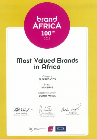 »ï¼ºÀüÀÚ°¡ ¾ÆÇÁ¸®Ä«¿¡¼ ¡®°¡Àå °¡Ä¡ÀÖ´Â ºê·£µå¡¯ (Most Valued Brands in Africa)·Î ¼±Á¤µÆ´Ù. »ï¼ºÀüÀÚ´Â 18ÀÏ ¸ðµç ºÐ¾ß¸¦ ¸Á¶óÇÑ ¡®ºê·£µå ¾ÆÇÁ¸®Ä« 100¡¯ Áß 13¾ï 2,900¸¸´Þ·¯ °¡Ä¡·Î 10À§¿¡ ¼±Á¤µÆ´Ù°í ¹àÇû´Ù. ƯÈ÷, »ï¼ºÀüÀÚ´Â ÀüÀÚÁ¦Ç° Ä«Å×°í¸®(Ele¡¦