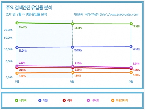 ¾î¸ÞÀÌ¡¼ÒÇÁÆ®(AmazingSoft)°¡ ¿î¿µÇÏ´Â À¥ ·Î±×ºÐ¼® ¼ºñ½ºÀÎ ¿¡À̽ºÄ«¿îÅÍ´Â 2011³âµµ 3»çºÐ±â °Ë»ö¿£Áø À¯ÀÔ·ü ºÐ¼® °á°ú¸¦ 20ÀÏ ¹ßÇ¥Çß´Ù. ³×À̹öÀÇ 3»çºÐ±â Æò±Õ À¯ÀÔ·üÀº 72.74%·Î Áö³ 2»çºÐ±â Æò±Õ 72.88%¿¡ ºñÇØ ¼ÒÆø Ç϶ôÇßÀ¸³ª, 2011³â µé¾î ¸Å¿ù 72% ÀÌ¡¦