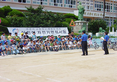 °ÅÁ¦°æÂû¼(¼Àå ÃÖ°æÈ£)°¡ 14ÀÏ ¿ÀÈÄ ¿ÁÆ÷ÃʵîÇб³ Çлý 45¸íÀ» ´ë»óÀ¸·Î ¡®ÀÚÀü°Å¿îÀü¸éÇ㡯 ½ÃÇèÀ» ½Ç½ÃÇß´Ù.ÃʵîÇлýµéÀÇ ÀÚÀü°Å¸éÇã½ÃÇèÀº ¾î¸°À̵鿡°Ô ±³Åë¹ý±Ô¸¦ ±³À°, ±³Åë»ç°í¸¦ ¿¹¹æÇÑ´Ù´Â ÃëÁö´Ù.