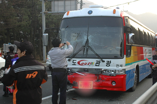 °ÅÁ¦¿¡¼ À¯Ä¡¿ø»ýÀÌ Åº °ü±¤¹ö½º°¡ Ãßµ¹ 4¸íÀÌ ºÎ»ó ´çÇß´Ù. 27ÀÏ ¿ÀÈÄ 4½Ã21ºÐ²² °ÅÁ¦½Ã HÀ¯Ä¡¿ø»ýµéÀÌ Åº °ü±¤¹ö½º 3´ë°¡ »çµî¸é ¿À·®¸® ûÆ÷ÁÖÀ¯¼Ò Àα٠µµ·Î¿¡¼ Ãßµ¹Çß´Ù. ÀÌ »ç°í·Î ¿ø»ý K±º(6)µî 4¸íÀÌ ºÎ»óÀ» ´çÇØ Àα٠º´¿ø¿¡¼ Ä¡·áÁßÀÌ´Ù.