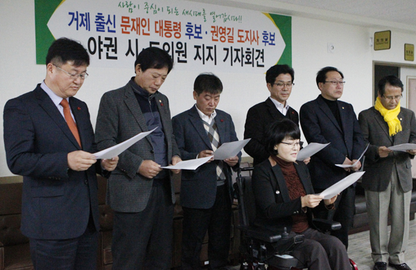 °ÅÁ¦Ãâ½Å ¾ß±Ç ¹× ¹«¼Ò¼Ó ½ÃµµÀÇ¿øµéÀÌ ¹®ÀçÀÎ ´ëÅë·ÉÈĺ¸¿Í ±Ç¿µ±æ Èĺ¸ ÁöÁö¸¦ ¼±¾ðÇß´Ù. 14ÀÏ ¿ÀÀü 9½Ã 50ºÐ °ÅÁ¦½ÃÀÇȸ 2Ãþ ÀÇ¿ø½Ç¿¡¼ ±âÀÚȸ°ßÀ» °®°í ÁöÁö¼±¾ð¹°À» ¹ßÇ¥Çß´Ù. À̳¯ ±âÀÚȸ°ß¿¡´Â ±èÇØ¿¬, À̱æÁ¾ °æ³²µµÀÇ¿ø, ±èÀºµ¿, ¹ÚÀå¼·, À¯¿µ¼ö , ÀÌÇࡦ