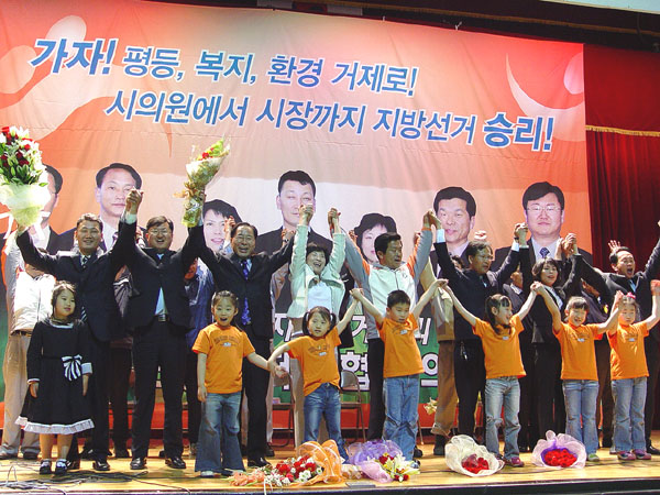 ¹ÎÁÖ³ëÃÑ °ÅÁ¦½ÃÇùÀÇȸ´Â Áö³ 11ÀÏ ¿ÀÈÄ 7½Ã °ÅÁ¦½Ã ½Ç³»Ã¼À°°ü¿¡¼ Áö¹æ¼±°Å ½Â¸® ¹ÎÁÖ³ëÃÑ ÀüÁø´ëȸ¸¦ ¿°í ¹ÎÁÖ³ëÃÑÀº ¹ÎÁֳ뵿´çÀÇ È常¦ ÁöÁöÇÑ´Ù°í ¹àÇû´Ù. À̳¯ °áÀÇ´ëȸ¿¡´Â ±Ç¿µ±æ ÀÇ¿ø°ú ÀÌÈï¼® ¹ÎÁÖ³ëÃÑ °æ³²º»ºÎÀå, ±è¿µ±æ ¹ÎÁֳ뵿´ç °æ³²µµ´ç »óÀÓ¼±¡¦