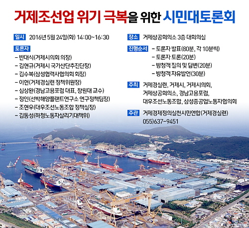 Á¶¼±»ê¾÷ À§±â±Øº¹À» À§ÇÑ ½Ã¹Î´ëÅä·Ðȸ°¡ ¿À´Â 24ÀÏ ¿ÀÈÄ 2½Ã °ÅÁ¦»ó°øÈ¸ÀÇ¼Ò 3Ãþ ´ëȸÀǽǿ¡¼ ¿¸°´Ù. °ÅÁ¦°æÁ¦Á¤ÀǽÇõ½Ã¹Î¿¬ÇÕ(°ÅÁ¦°æ½Ç·Ã)À» ºñ·ÔÇÑ 7°³ ±â°ü(´Üü)ÀÌ °øµ¿ ÁÖÃÖÇÏ´Â À̳¯ ´ëÅä·Ðȸ´Â °ÅÁ¦Áö¿ª¿¡ ´ÚÄ£ Á¶¼±»ê¾÷ À§±âÀÇ ¿øÀΰú ÇöÀç »óȲÀ» Áø´Ü¡¦