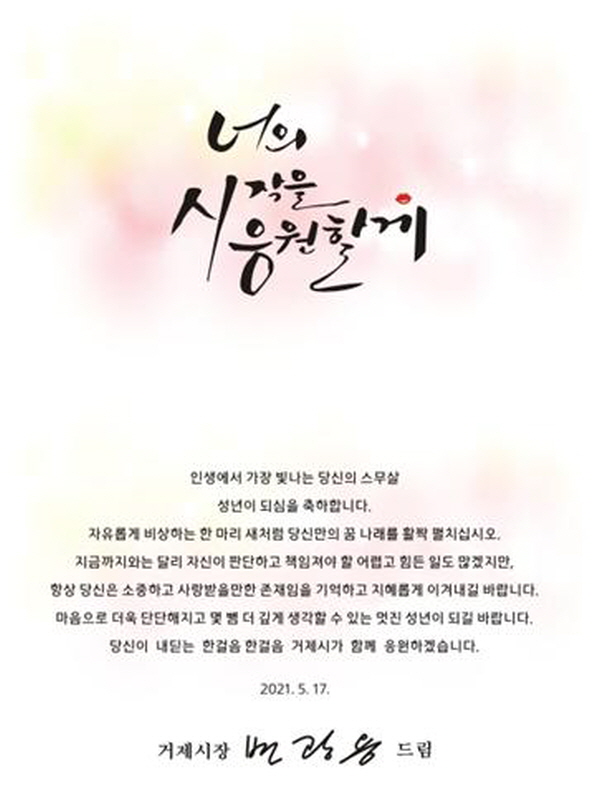 °ÅÁ¦½Ã(½ÃÀå º¯±¤¿ë)Àº 17ÀÏ ¡®Á¦49ȸ ¼º³âÀÇ ³¯À» ¸Â¾Æ ¿ÃÇØ ½º¹«»ìÀÌ µÇ´Â 2002³â»ý 2639¸í¿¡°Ô ÃàÇÏÄ«µå¸¦ º¸³Â´Ù. Äڷγª·Î ÀÎÇØ ¼º³âÀÇ ³¯ ±â³äÇà»çÀÎ ¼º³â·Ê¸¦ ´ë½ÅÇÏ¿© ¼º³âÀ» ¸ÂÀÌÇÑ Ã»¼Ò³âÀÌ Ã¥ÀÓ°¨ ÀÖ´Â ¼º³âÀ¸·Î ¼ºÀåÇÒ ¼ö ÀÖµµ·Ï ÀÀ¿øÇϰí, ¿ì¸® »çȸ ±¸¡¦