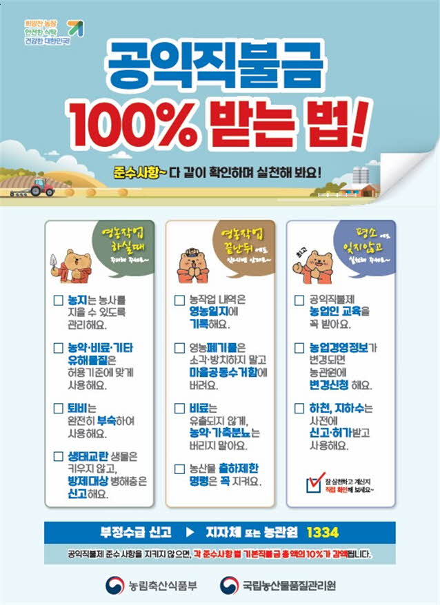 ±¹¸³³ó»ê¹°Ç°Áú°ü¸®¿ø °æ³²Áö¿ø(Áö¿øÀå ¹é¿îȰ, ÀÌÇÏ °æ³² ³ó°ü¿ø)Àº ¿ÃÇØ ±âº»Çü °øÀÍÁ÷ºÒ±ÝÀ» ½ÅûÇÑ ºÎ»ê¡¤¿ï»ê¡¤°æ³²Áö¿ª 18¸¸4000¿© ³ó°¡¸¦ ´ë»óÀ¸·Î °øÀÍÁ÷ºÒÁ¦ Àǹ« Áؼö»çÇ׿¡ ´ëÇÑ ÀÌÇà¿©ºÎ¸¦ 7¿ù 1ÀϺÎÅÍ 9¿ù 15ÀϱîÁö Á¡°ËÇÑ´Ù°í ¹àÇû´Ù. °øÀÍÁ÷ºÒÁ¦´Â¡¦