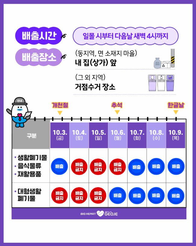 °ÅÁ¦½Ã(½ÃÀå º¯±¤¿ë)´Â ´Ù°¡¿À´Â Ãß¼® ¸íÀý »ýȰÆó±â¹° ó¸® ´ëÃ¥À» ½ÃÇàÇÑ´Ù°í 16ÀÏ ¹àÇû´Ù. ½Ã´Â Ãß¼® ¿¬ÈޱⰣ(10. 3. ~ 10. 9.) Áß »ýȰÆó±â¹° ¼ö°Å ´ëÇà¾÷ü ÈÞ¹«(ÀÏ¿äÀÏ, Ãß¼®, Ãß¼® ´ÙÀ½³¯)¿¡ µû¶ó »ýȰ¡¤À½½Ä¡¤ÀçȰ¿ëǰ¡¤´ëÇü»ýȰÆó±â¹°ÀÇ ¹èÃâÀϰú ¹èÃâ½Ã°£¡¦