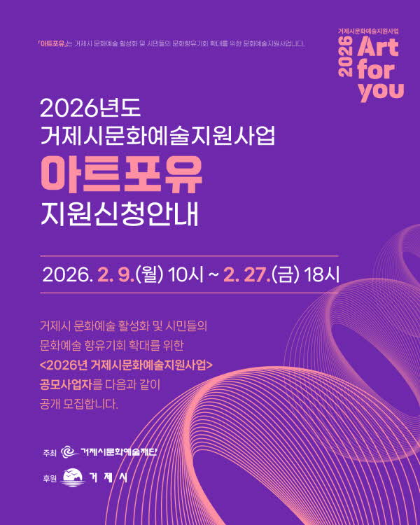 °ÅÁ¦½Ã¹®È¿¹¼úÀç´Ü(ÀÌ»çÀå º¯±¤¿ë)Àº Áö¿ª ¿¹¼úÀÎÀÇ Ã¢ÀÛ È°µ¿À» Àû±Ø Áö¿øÇϱâ À§ÇÑ 2026³âµµ °ÅÁ¦½Ã¹®È¿¹¼úÁö¿ø»ç¾÷ ¡®¾ÆÆ®Æ÷À¯(Art for You)¡¯ °ø¸ð¸¦ 2ÀÏ(¿ù)ºÎÅÍ ½ÃÀÛÇß´Ù. ¿ÃÇØ »ç¾÷ ±Ô¸ð´Â ÃÑ 3¾ï 5000¸¸ ¿ø, »ç¾÷ ±â°£Àº 3¿ùºÎÅÍ 11¿ù±îÁö´Ù. Áö³ÇØ ¡¦