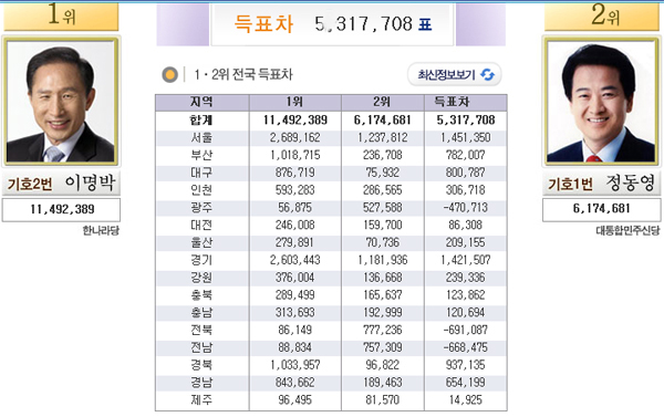 À̸í¹Ú È帰¡ Á¦17´ë ´ëÅë·É¿¡ ´ç¼±µÆ´Ù. 48.67%, °ú¹Ý¼ö¿¡ °¡±î¿î ¾ÐµµÀûÀÎ ÁöÁö´Ù. Çѳª¶ó´ç À̸í¹Ú È帴 ÅëÇÕ¹ÎÁֽŴç Á¤µ¿¿µ È常¦ 500¸¸Ç¥ ÀÌ»ó Â÷¸¦ ¹ú·È´Ù. À̸í¹Ú È帴 1149¸¸2389¸íÀ¸·ÎºÎÅÍ ÁöÁö¸¦ ¹Þ¾Ò°í Á¤µ¿¿µ È帴 617¸¸4681¸íÀÇ ÁöÁö¸¦ ÀÌ¡¦