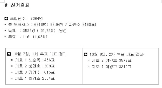 ¼º ´ç¼±ÀÚ´Â 8ÀÏ ¿ÀÀü Ä¡·¯Áø ´ë¿ìÁ¶¼±Çؾç³ëµ¿Á¶ÇÕÀ§¿øÀå ¼±°Å °á¼±ÅõÇ¥¿¡¼ 3582Ç¥¸¦ ¾ò¾î 3220Ç¥¸¦ ¾òÀº ÀÌ¿µÈ£(³ë°³¿¬) È常¦ 362Ç¥Â÷·Î ¾Õ¼¹´Ù.