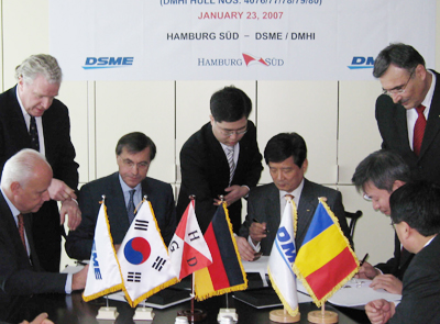 ´ë¿ìÁ¶¼±Çؾç(´ëÇ¥ ³²»óÅÂ, www.dsme.co.kr)Àº 25ÀÏ ´ë¿ì¸Á°¥¸®¾ÆÁ¶¼±¼Ò¿¡¼ °ÇÁ¶ÇÒ 4,710TEU±Þ ÄÁÅ×À̳ʼ± 5ôÀ» µ¶ÀÏÀÇ ÇԺθ£±× ¼öµå(Hamburg Sud)»ç·ÎºÎÅÍ ¼öÁÖÇß´Ù°í ¹àÇû´Ù. ÀÌ ¼±¹ÚµéÀÇ °¡°ÝÀº ÃÑ ¾à 5¾ï ´Þ·¯¿¡ ´ÞÇϸç, ¿À´Â 2010³â »ó¹Ý±â±îÁö ÀεµµÉ ¿¹Á¤ÀÌ´Ù. ´ë¿ì¸Á°¥¸®¾ÆÁ¶¼±¼Ò(´ëÇ¥ ÀÌÀçºÀ, Daewoo Mangalia Heavy Industries S.A.)´Â ´ë¿ìÁ¶¼±ÇؾçÀÌ 1997³â ÀμöÇÑ ·ç¸¶´Ï¾Æ ÇöÁö ¹ýÀÎÀÌ´Ù. À̹ø °è¾à¿¡´Â 1ô ´õ °è¾àÇÒ ¼ö ÀÖ´Â ¿É¼ÇÀÌ ÀÖ¾î Ãß°¡ ¼öÁÖµµ ±â´ëµÈ´Ù.