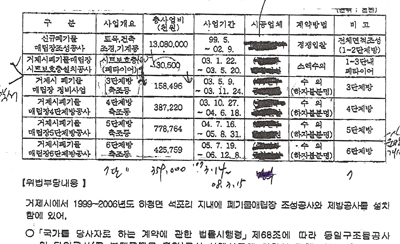 °ÅÁ¦½Ã´Â Áö³ 2003³â 1¿ù °ÅÁ¦½Ã Æó±â¹° ¸Å¸³Àå ½ÃÆ®º¸È£Ãþ ¼³Ä¡°ø»ç¸¦ M°Ç¼³¿¡ 3050¸¸¿ø¿¡ ¸Ã°å´Ù. °ÅÁ¦½Ã´Â ÀÌ °ÇÀ» °è±â·Î °°ÀºÇØ 5¿ùºÎÅÍ Áö³ 3¿ù±îÁö 5Â÷·Ê¿¡ °ÉÃÄ ¸Å¸³Àå Á¤ºñ»ç¾÷°ú ¸Å¸³Àå Á¦¹æ°ø»ç 20¿©¾ï¿øÀÇ °ø»ç¸¦ ¼öÀ§°è¾àÇß´Ù.