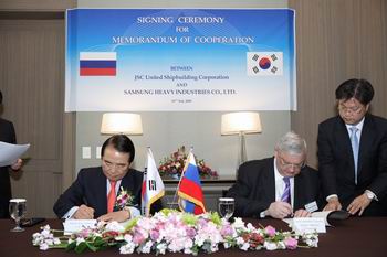 À̳¯ ü°áµÈ MOU´Â ·¯½Ã¾Æ Àüü Á¶¼±»ê¾÷À» °üÀåÇÏ´Â USC»ç ȸÀåÀ» °âÀÓÇϰí ÀÖ´Â ¼¼Ä£ ºÎÃѸ® ¹× À̹ټ¾ÃÊÇÁ(Ivashentsov) ÁÖÇÑ·¯½Ã¾Æ ´ë»ç°¡ ÇÔ²² ÇÑ ÀÚ¸®¿¡¼­ USC»ç ÆÄÅ©¸ðÇÁ(Pakhomov)»çÀå°ú »ï¼ºÁß°ø¾÷ ±è¡¿Ï ºÎȸÀåÀÌ Á÷Á¢ ¼­¸íÇß´Ù.