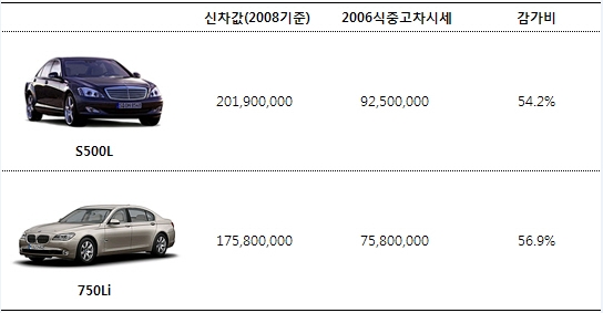 ³×À̹öÀÇ ¿ÀÅä°Ô½ÃÆÇÀ» Âü°íÇÏ¸é º¥Ã÷ S500L°ú BMW 750Li ÀÇ °¡°ÝÀº °¢°¢ 2¾ï190¸¸¿ø, 1¾ï7580¸¸¿øÀÌ´Ù. SŬ·¡½º¿Í 7½Ã¸®Áî´ä°Ô ¸Å¿ì ³ôÀº °¡°ÝÀ» ÀÚ¶ûÇϰí ÀÖ´Ù. ±×·¸´Ù¸é 3³âÀÌ Áö³ 2006³â ½Ä Áß°íÂ÷ÀÇ °¡°ÝÀº ¾ó¸¶³ª µÉ±î?