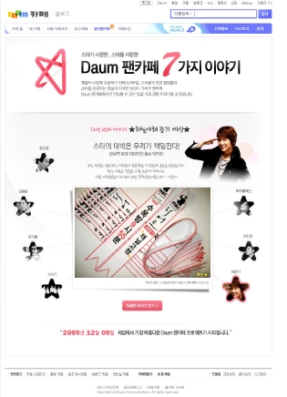 ¡®Á¦1±â Daum °ø½Ä ÆÒÄ«Æä¡¯´Â ´ÙÀ½¿¡ °³¼³µÈ ¹ÂÁö¼Ç, ¹è¿ì, ½ºÆ÷Ã÷ ¼±¼ö, ÀÛ°¡ µî ½ºÅ¸¸¦ ÀÀ¿øÇÏ´Â ÆÒÄ«Æä Áß °¢ ½ºÅ¸º°·Î Ä«ÆäÀÇ ·©Å· Á¡¼ö°¡ °¡Àå ³ôÀº ÆÒÄ«Æä¸¦ ´ë»óÀ¸·Î ¼±Á¤Çß´Ù. ½ºÅ¸°¡ ±×·ìÀÏ °æ¿ì °¢ ¸â¹öÀÇ °³º° ÆÒÄ«Æä´Â ¼±Á¤¿¡ Æ÷ÇԵǾúÀ¸¸ç, ºê·£µå³ª ÀÛǰ µî¿¡ ´ëÇÑ ÆÒÄ«Æä´Â À̹ø ¼±Á¤¿¡¼ Á¦¿ÜµÇ¾ú´Ù.