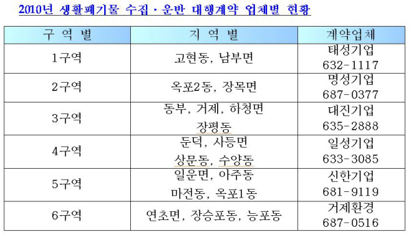 2010³â °ÅÁ¦Áö¿ª 6°³ ´ëÇà¾÷üÀÇ Ã»¼Ò´ëÇ౸¿ªÀº ¡ã°íÇöµ¿, ³²ºÎ¸é(żº±â¾÷) ¡ã¿ÁÆ÷2µ¿, Àå¸ñ¸é(¸í¼º±â¾÷) ¡ãµ¿ºÎ, °ÅÁ¦, ÇÏû, ÀåÆòµ¿(´ëÁø±â¾÷) ¡ãµÐ´ö, »çµî, »ó¹®, ¼ö¾çµ¿ (Àϼº±â¾÷) ¡ãÀÏ¿î, ¾ÆÁÖ, ¸¶Àü, ¿ÁÆ÷1µ¿(½ÅÇѱâ¾÷) ¡ã¿¬ÃÊ, Àå½ÂÆ÷, ´ÉÆ÷µ¿(°ÅÁ¦È¯°æ)ÀÌ´Ù.