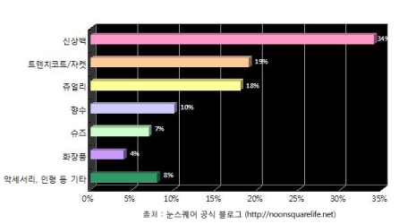 ÆÐ¼ÇÀ» »ç¶ûÇÏ´Â ¿©¼ºµéÀÇ »ó¡ ½Å»ó¹éÀÌ 34%·Î ¿©¼ºµéÀÇ ÁöÁö¸¦ ¹ÞÀ¸¸ç 1À§¸¦ Â÷ÁöÇß´Ù. µÚ¸¦ À̾î 2À§´Â º½ÀÇ ¸Ó½ºÆ®ÇØºê ¾ÆÀÌÅÛÀ̶ó ÇÒ ¼ö ÀÖ´Â Æ®·»Ä¡ ÄÚÆ®³ª ÀÚÄÏ(19%)ÀÌ, 3À§´Â ¿©Ä£À» ºí¸µºí¸µ ºû³ª°Ô ÇØÁÖ´Â Áê¾ó¸® ¾ÆÀÌÅÛÀÌ(18%), 4À§´Â ±×³à¸¸ÀÇ ½Ã±×´ÏÃÄ ¾ÆÀÌÅÛÀÎ Çâ¼ö(10%)°¡ ¼±ÅõǾúÀ¸¸ç 5À§´Â ÆÐ¼ÇÀÇ ¸¶¹«¸® ½´Áî(7%)°¡ Â÷ÁöÇß´Ù. À̿ܿ¡´Â ÈÀåǰ°ú ÀÎÇü µîÀÌ ±âŸÀǰßÀ¸·Î ²ÅÇû´Ù.